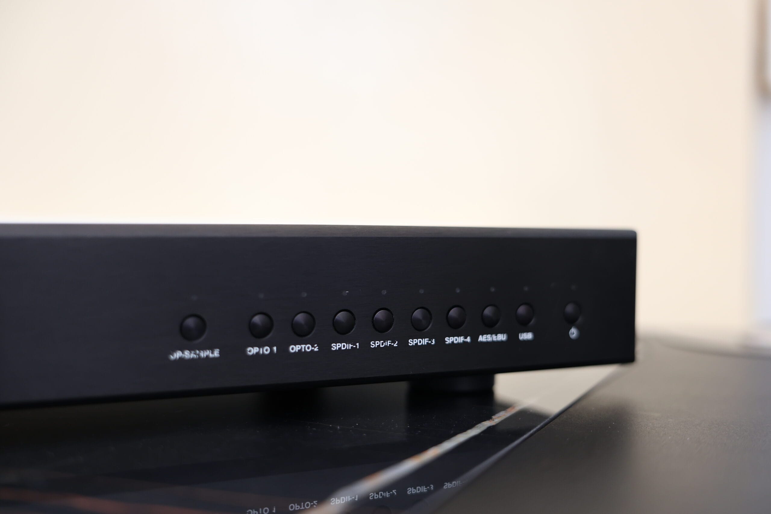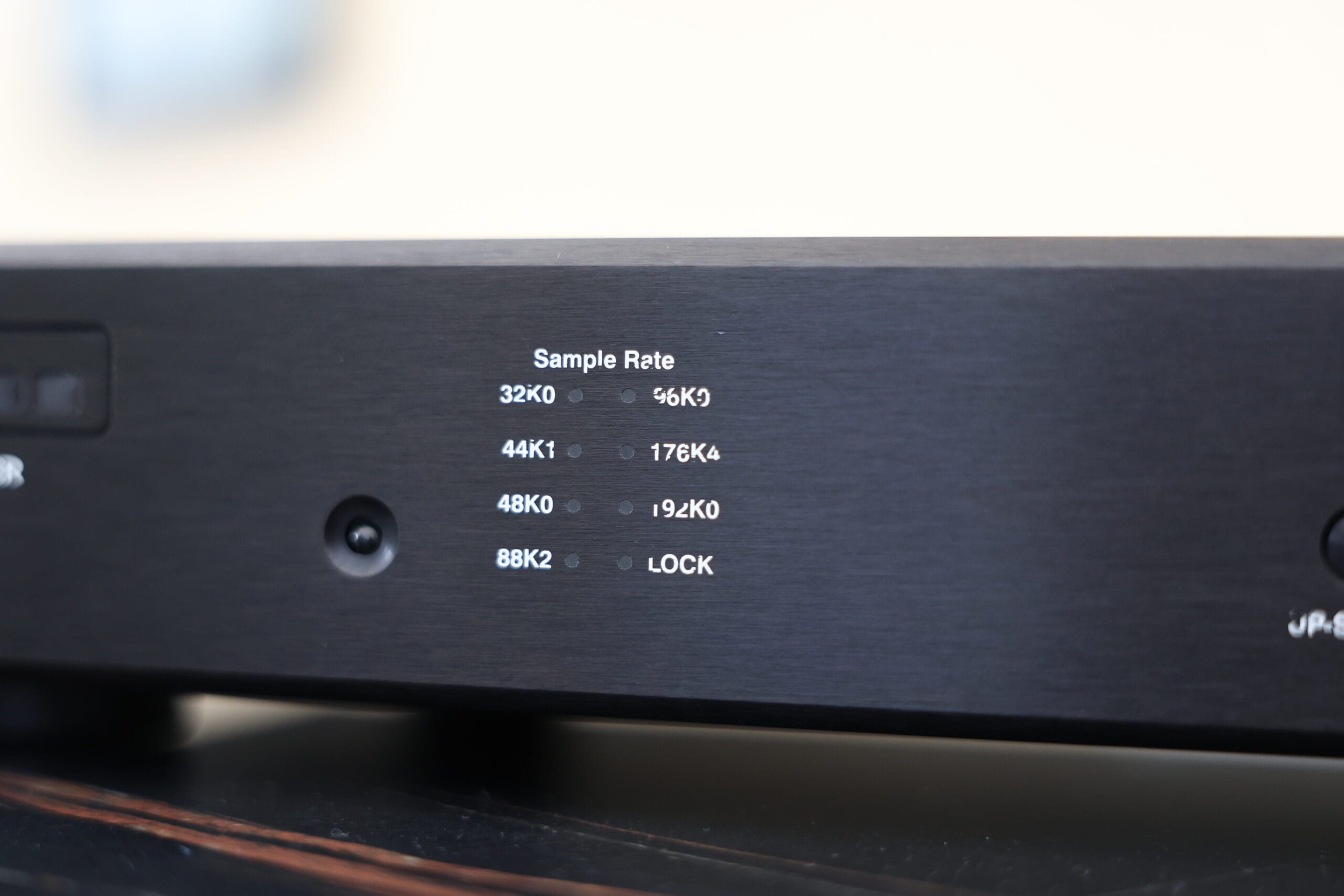 There is an upsample button the front panel, when turned on it will upsample incoming sample rates of 44.1K and 88.2K to 176.4K (the LED turns red), it will upsample incoming sample rates of 32K, 48K or 96K to 192K (the LED turns green)