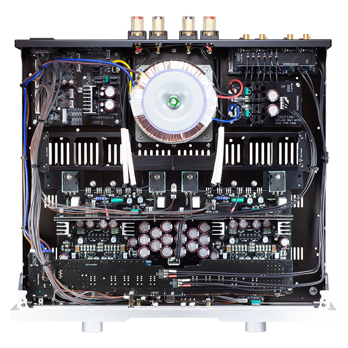 A non-impregnated toroidal power transformer is adopted. By deliberately limiting the secondary output voltage (the amplifier’s maximum output), current delivery capability has been enhanced. It delivers impressive drive capability with a responsive drive, even for low-impedance modern high-end loudspeakers.